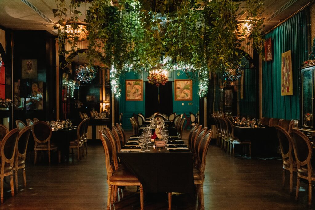 A refined, character-rich space ideal for meetings, private dinners, and full or partial buyouts. Bold floral patterns, warm wood tones, and statement chandeliers create an intimate yet sophisticated atmosphere, complemented by award-winning cuisine and attentive service.